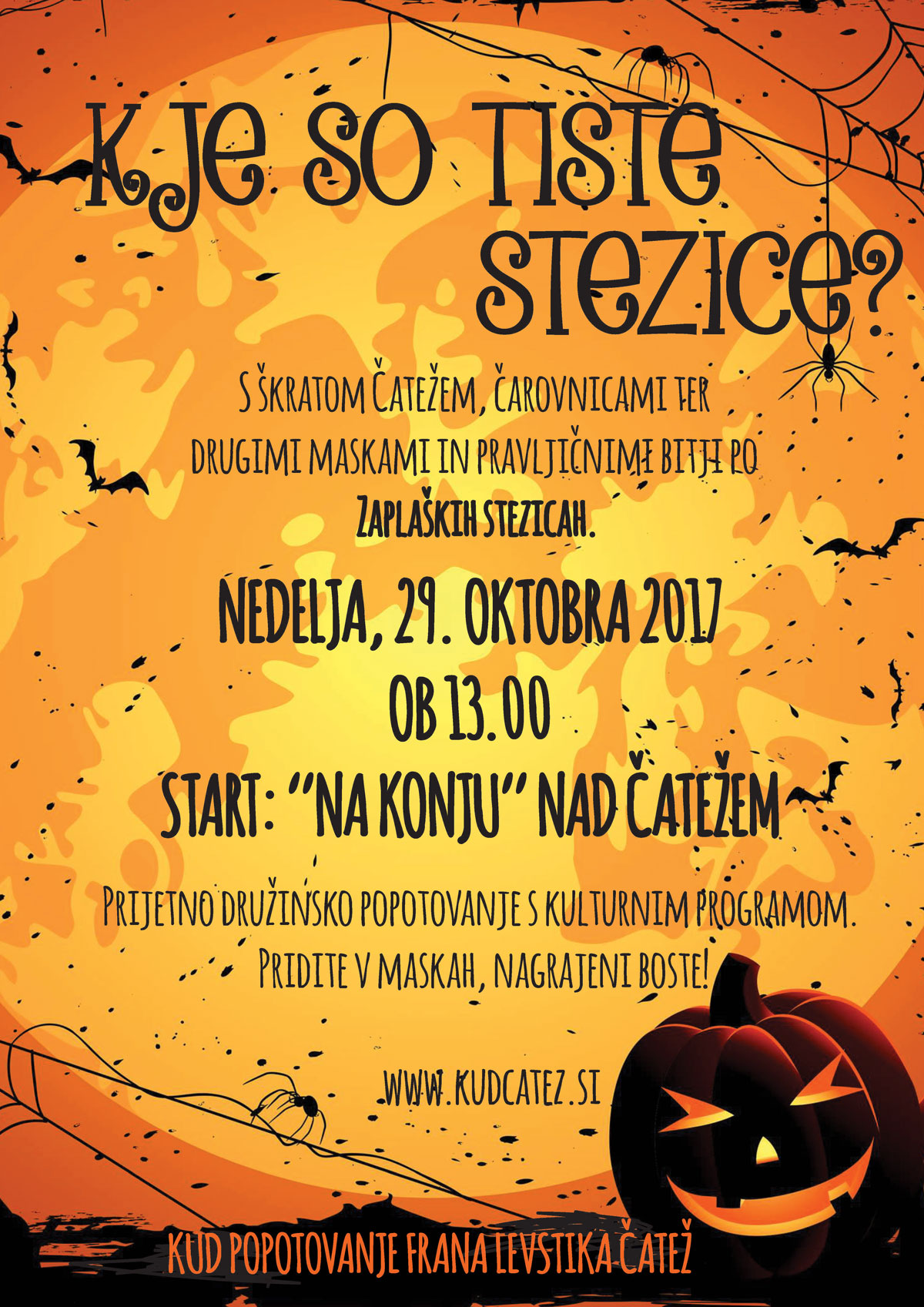 Nedeljski organiziran pohod po gozdni učni poti bo nekaj posebnega, tokrat v znamenju prihajajoče Noči čarovnic. S škratom Čatežem, čarovnicami ter drugimi pravljičnimi bitji se bomo skupaj povzpeli na najvišjo točko Občine Trebnje, Bajturn. Med potjo bomo lahko uživali v kulturnih točkah domačih in tujih kulturnikov.
