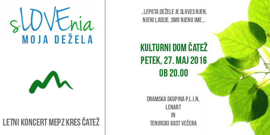 V petek, 27.5.2016 MePZ Kres pripravlja letni koncert z naslovom Slovenija, moja dežela. Koncert se bo pričel ob 20.00 uri, v Kulturnem domu na Čatežu. Program bodo s svojimi zabavnimi vložki povezovali P.L.i.Novci, svoj pečat pa bo vtisnil tudi Lenart, ki spretno vihti palčke po ksilofonu. Pridružil se nam bo tudi skriti gost, ki nas bo očaral s svojim tenorskim glasom.
