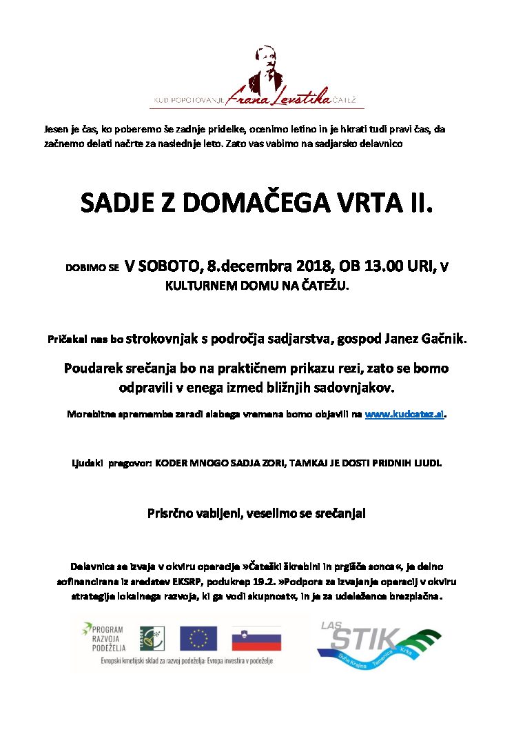 Dobimo se v SOBOTO, 8. DECEMBRA 2018, ob 13.00 URI, v Kulturnem domu na Čatežu.